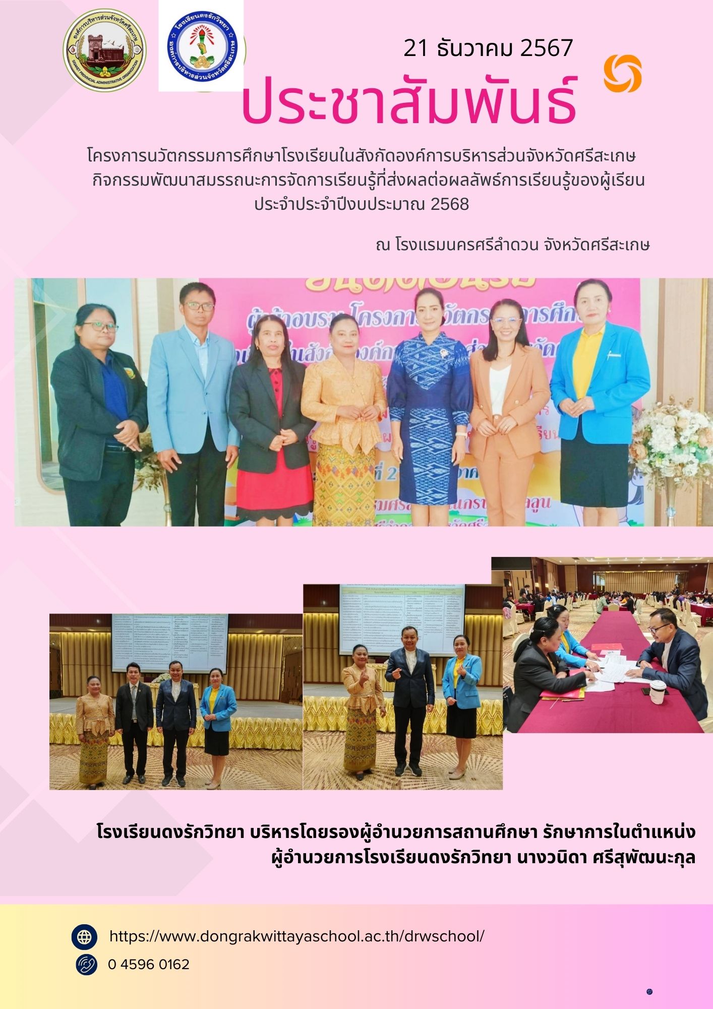 @@@ โรงเรียนดงรักวิทยา เข้าร่วมโครงการนวัตกรรมการศึกษาโรงเรียนในสังกัดองค์การบริหารส่วนจังหวัดศรีสะเกษ กิจกรรมพัฒนาสมรรถนะการการเรียนรู้ที่ส่งผลต่อผลลัพธ์การเรียนรู้ของผู้เรียน ประจำปีงบประมาณ 2568 @@@
