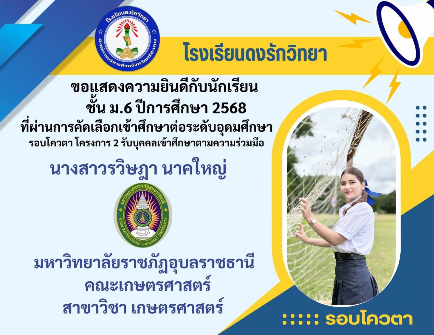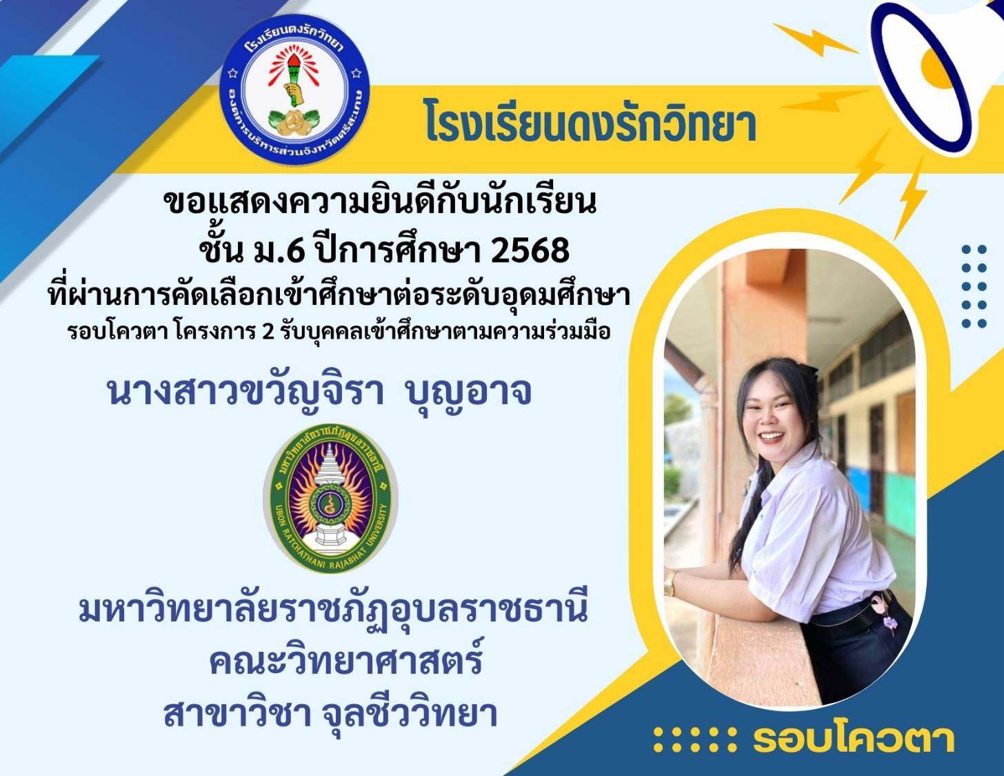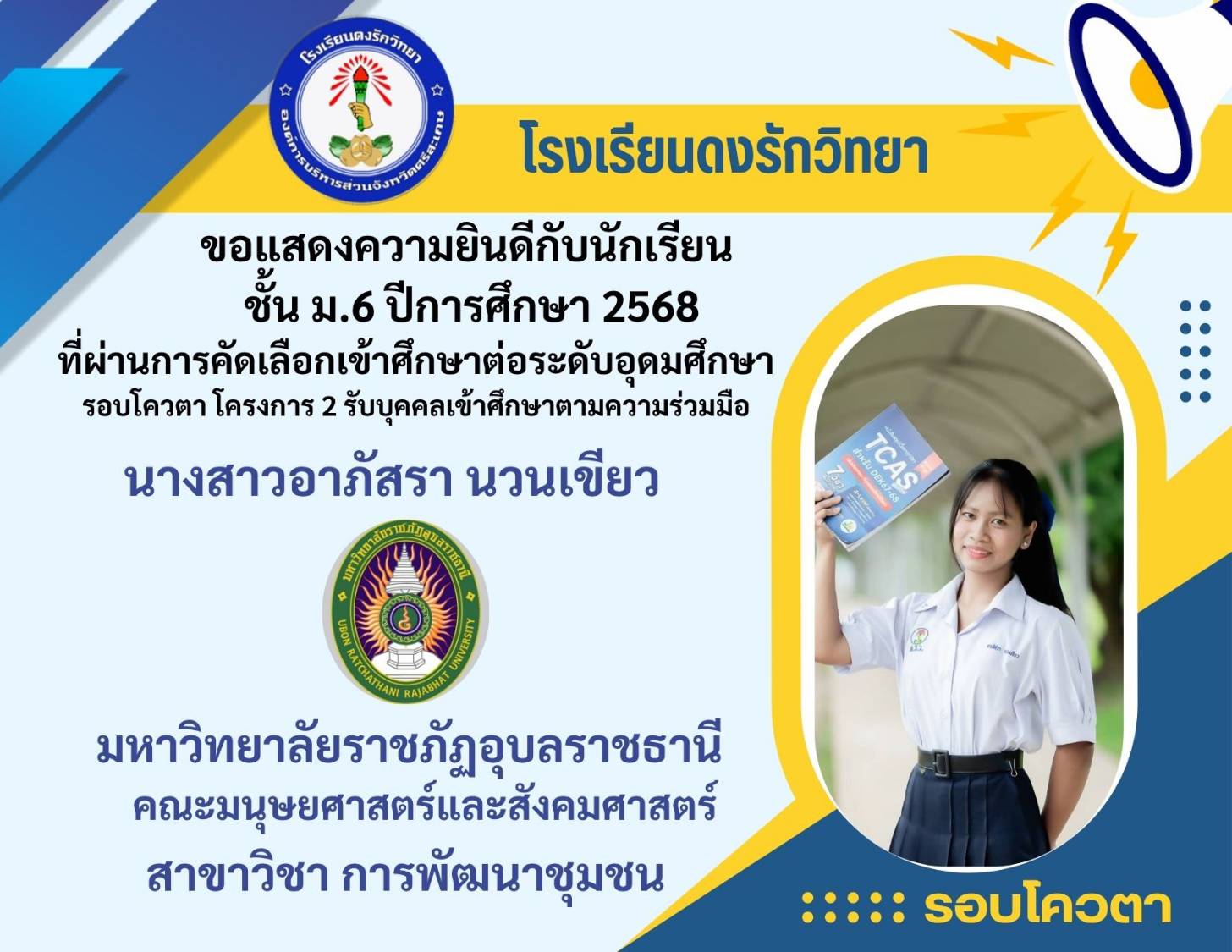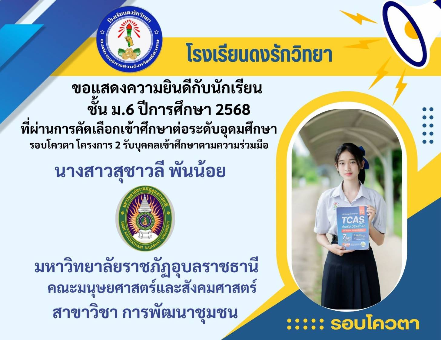 โรงเรียนดงรักวิทยาขอแสดงความยินดีกับ นางสาวศิรามณี แสนสุข นักเรียนชั้นมัธยมศึกษาปีที่ 6 ผ่านการสอบคัดเลือกโครงการครูรักษ์ถิ่น มหาวิทยาลัยขอนแก่น ประจำปี 2568