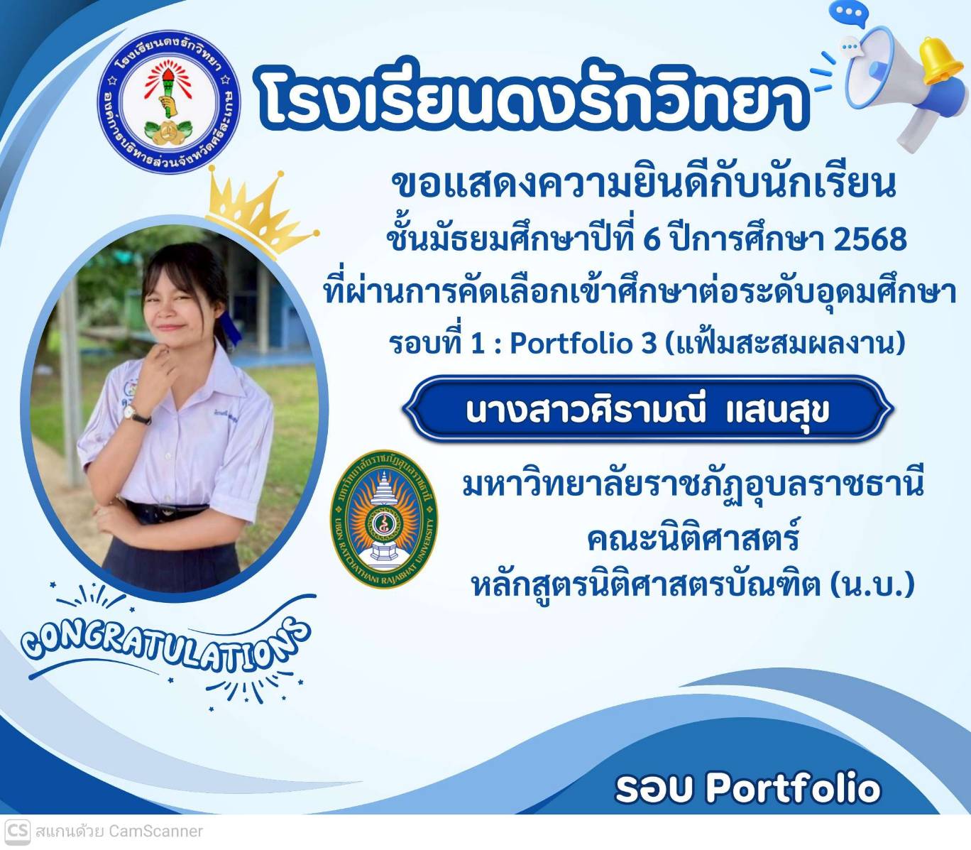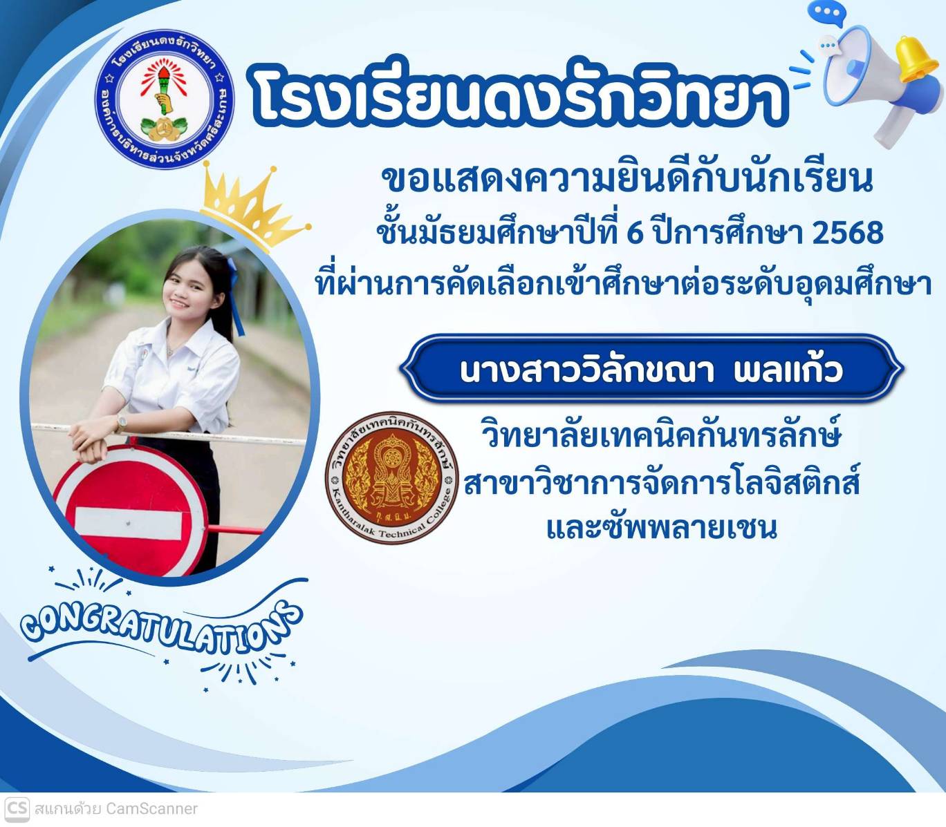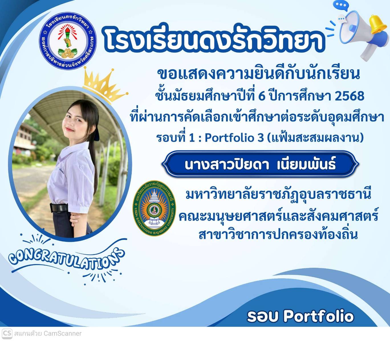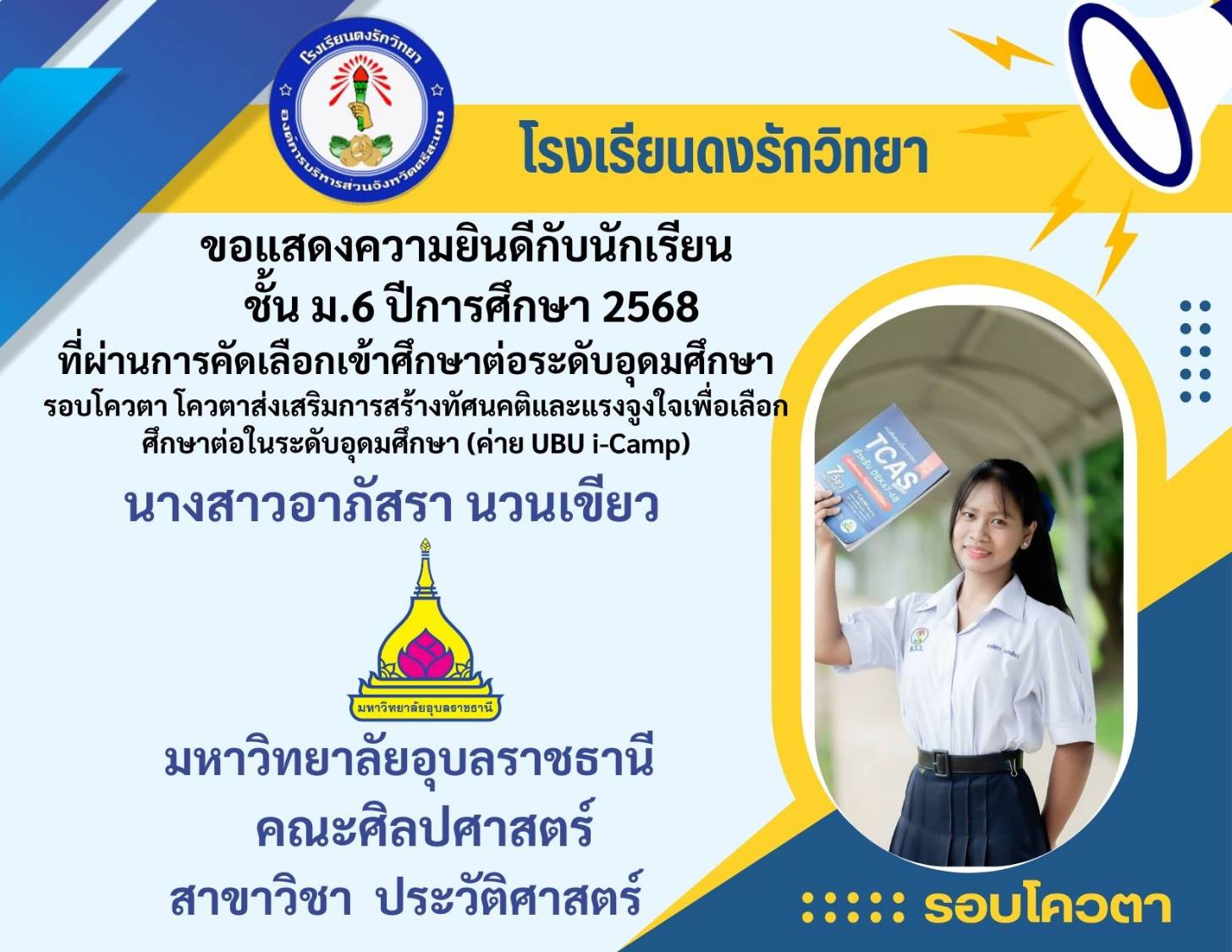 โรงเรียนดงรักวิทยาขอแสดงความยินดีกับ นางสาวศิรามณี แสนสุข นักเรียนชั้นมัธยมศึกษาปีที่ 6 ผ่านการสอบคัดเลือกโครงการครูรักษ์ถิ่น มหาวิทยาลัยขอนแก่น ประจำปี 2568