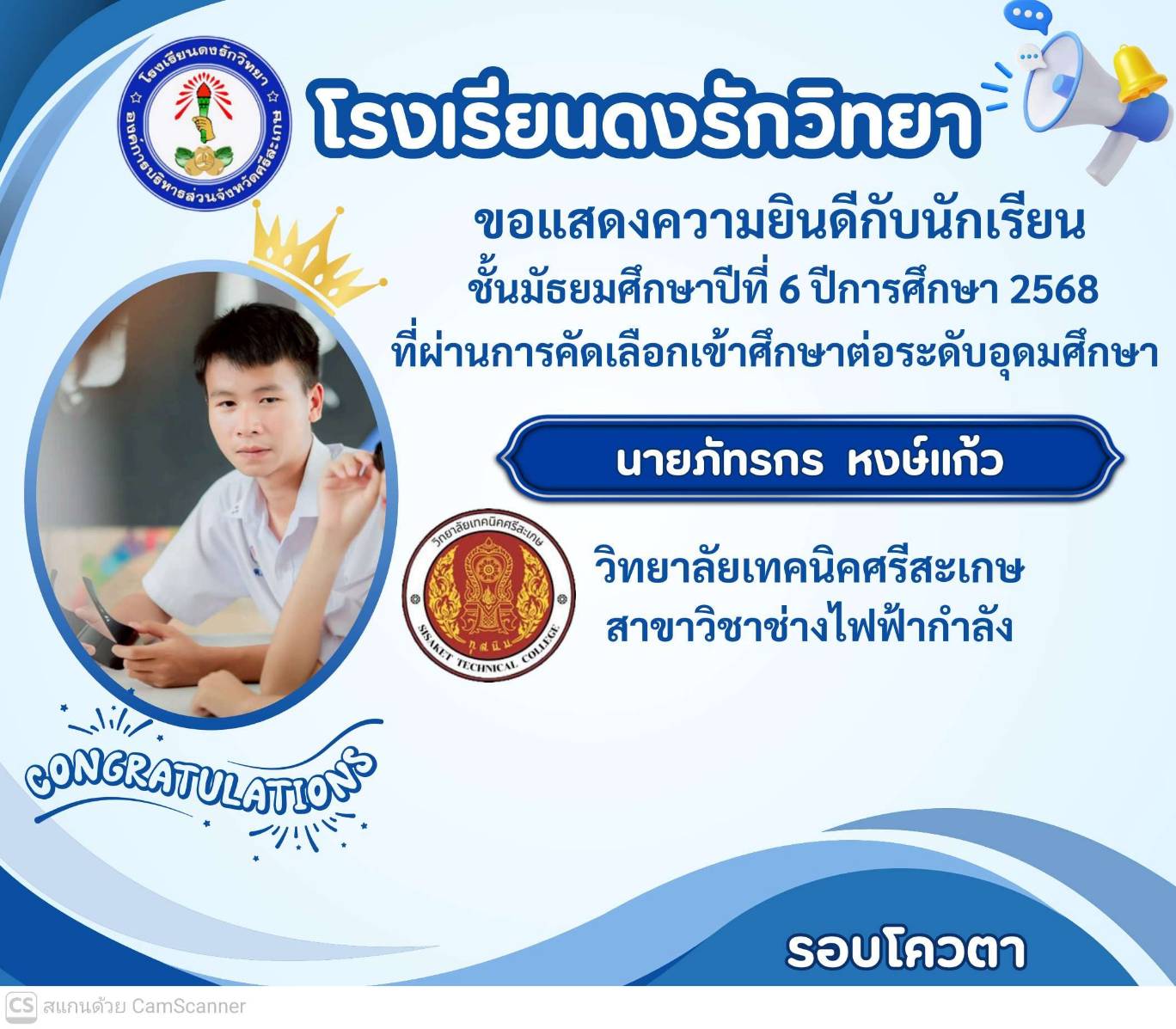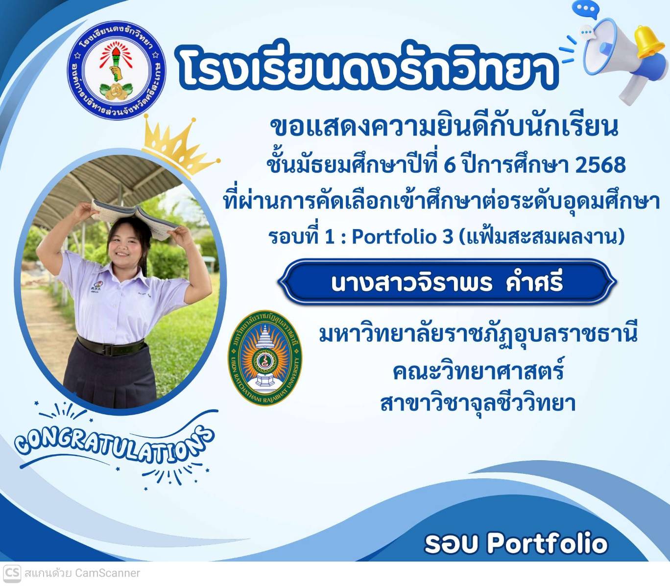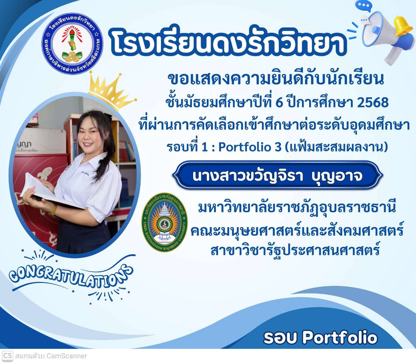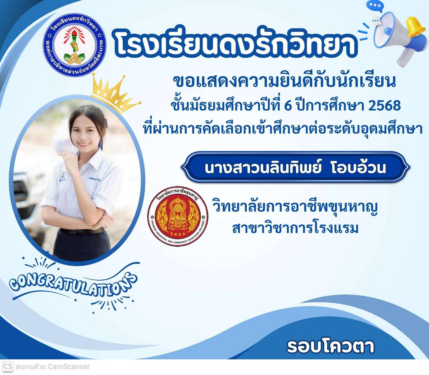 โรงเรียนดงรักวิทยาขอแสดงความยินดีกับ นางสาวศิรามณี แสนสุข นักเรียนชั้นมัธยมศึกษาปีที่ 6 ผ่านการสอบคัดเลือกโครงการครูรักษ์ถิ่น มหาวิทยาลัยขอนแก่น ประจำปี 2568