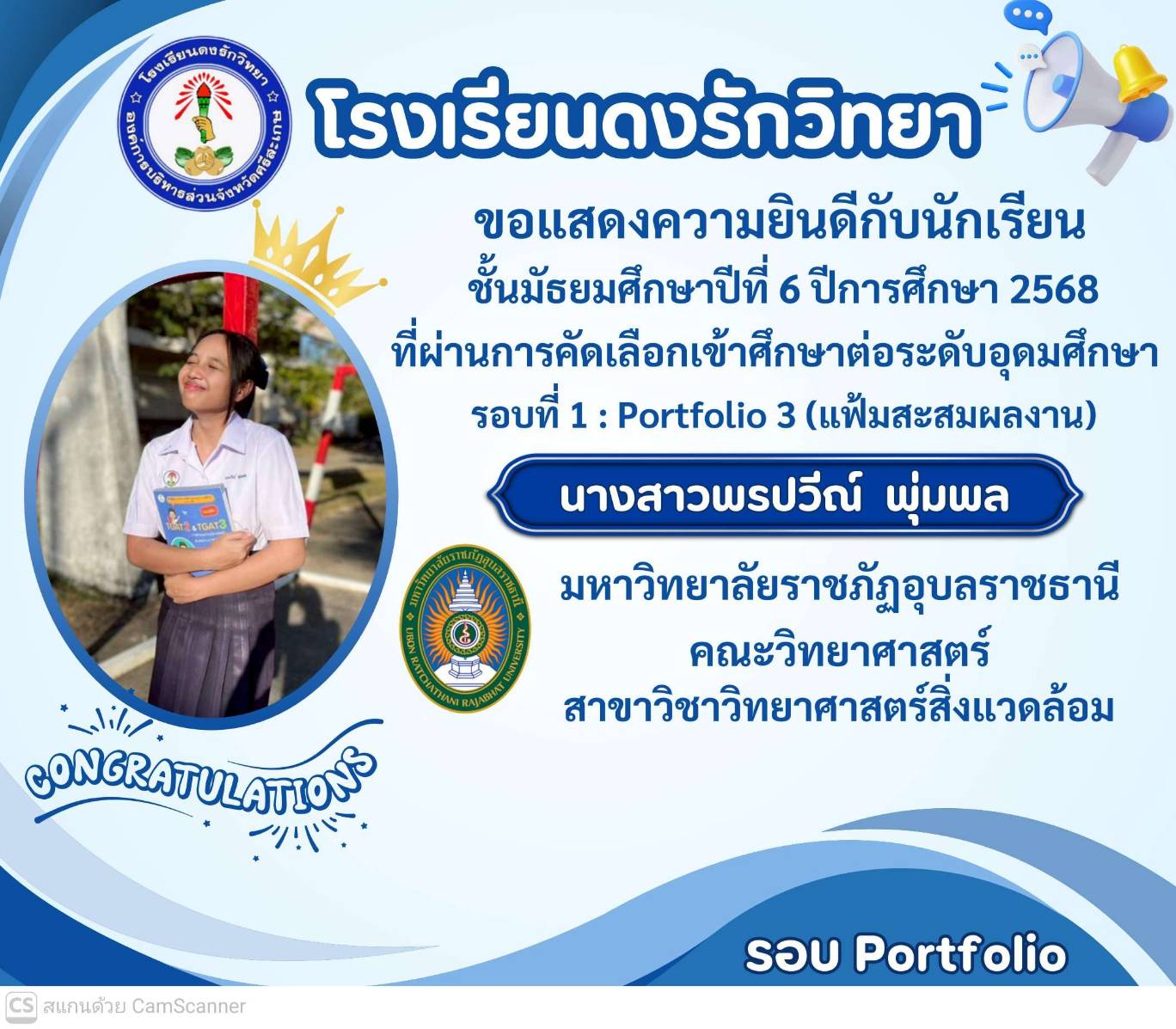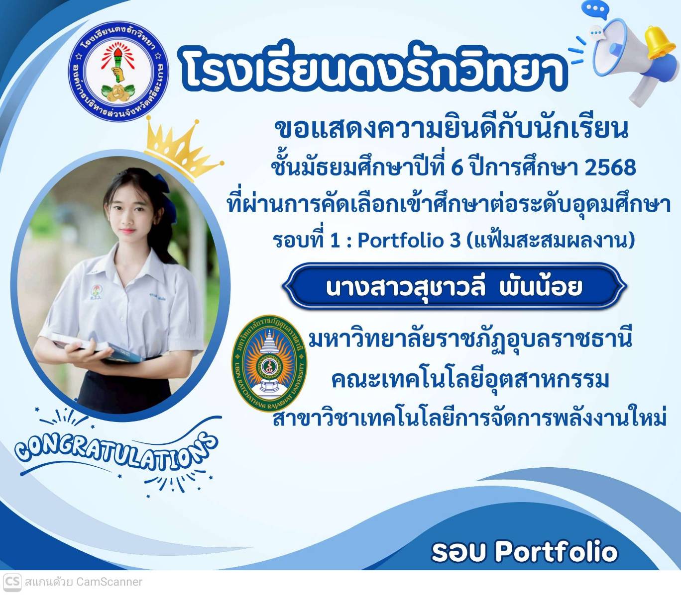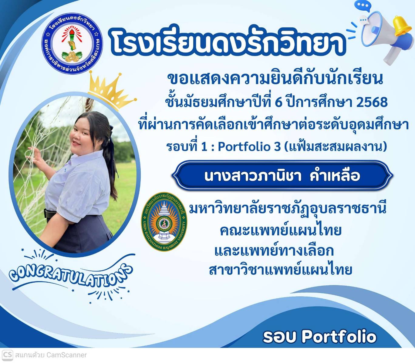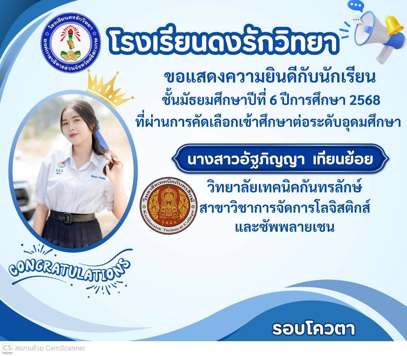 โรงเรียนดงรักวิทยาขอแสดงความยินดีกับ นางสาวศิรามณี แสนสุข นักเรียนชั้นมัธยมศึกษาปีที่ 6 ผ่านการสอบคัดเลือกโครงการครูรักษ์ถิ่น มหาวิทยาลัยขอนแก่น ประจำปี 2568
