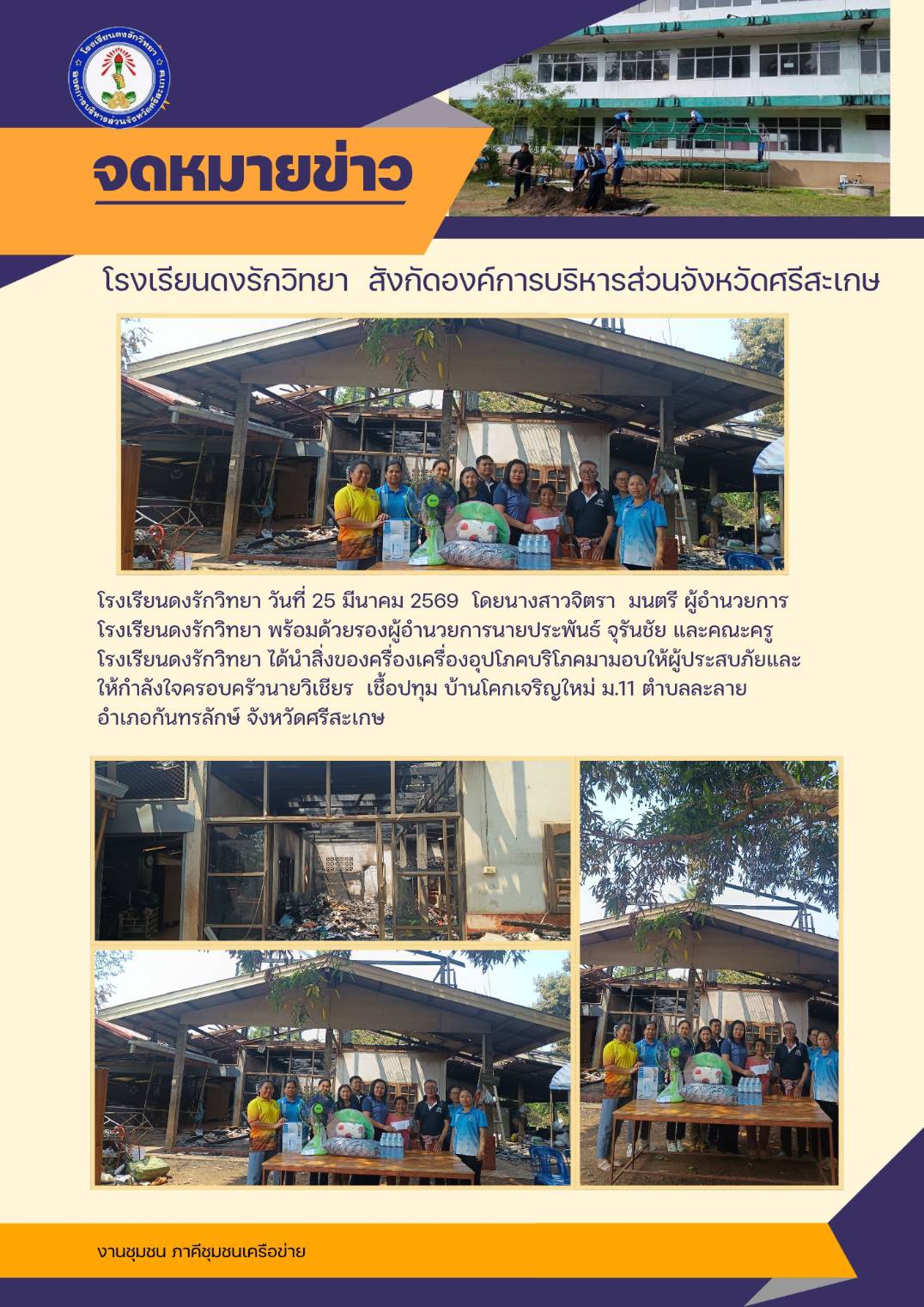 เมื่อวันที่ 25 มีนาคม 2569 นางสาวจิตรา มนตรี ผู้อำนวยการโรงเรียนดงรักวิทยา พร้อมด้วยคณะครู ให้กำลังใจนายวิเชียร เชื้อประทุม ชาวบ้านโคกเจริญเนื่องจากบ้านประสบอัคคีภัย