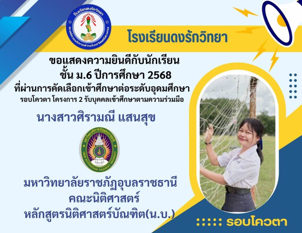 ข่าวประชาสัมพันธ์, ผลงานวิชาการโรงเรียนดงรักวิทยาขอเเสดงความยินดี กับนักเรียนชั้นมัธยมศึกษาปีที่ 6 ที่ผ่านการคัดเลือกเข้ามหาวิทยาลัย ปีการศึกษา 2569ในรอบโควต้า admin / 16 พฤศจิกายน 2025 โรงเรียนดงรักวิทยาขอ