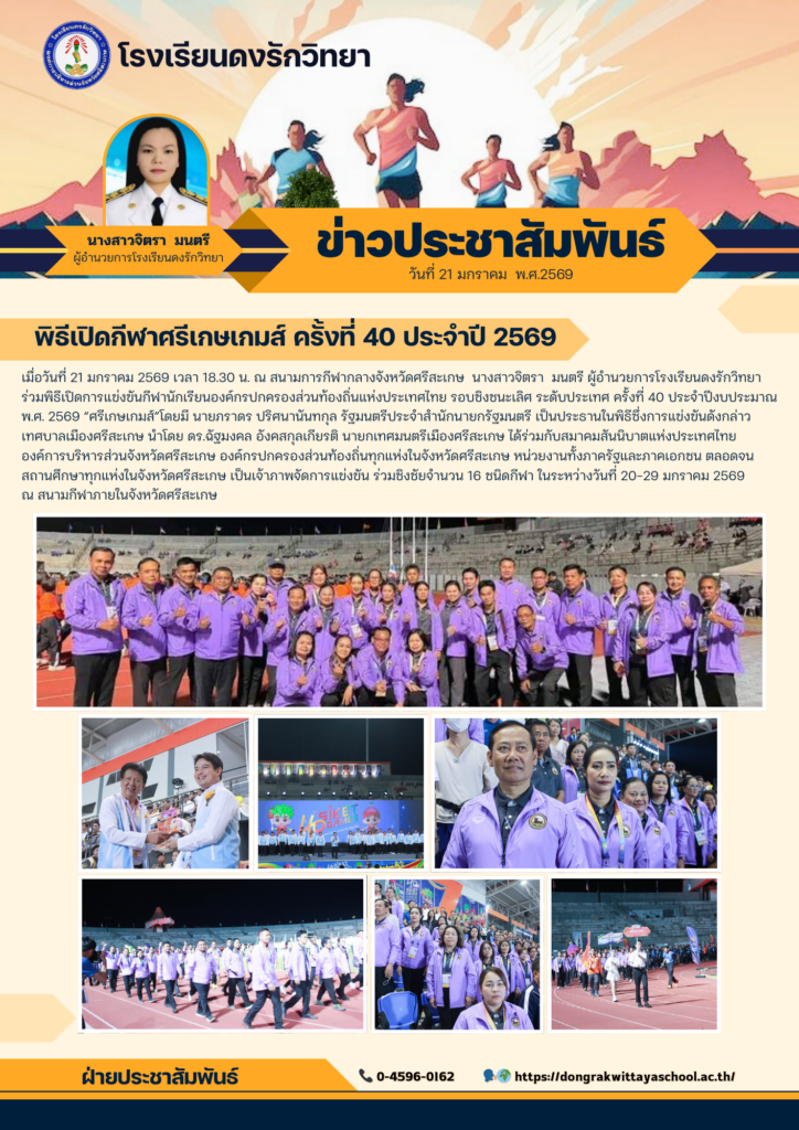 ข่าวกิจกรรม, ข่าวประชาสัมพันธ์, จดหมายข่าวประชาสัมพันธ์เมื่อวันที่ 21 มกราคม 2569 นางสาวจิตรา มนตรี ผู้อำนวยการโรงเรียนดงรักวิทยา ร่วมพิธีเปิดกีฬาศรีเกษเกมส์ ครั้งที่ 40 ประจำปี 2569 admin / 27 มกราคม 2026 เมื่อวันที่ 21 มกราค