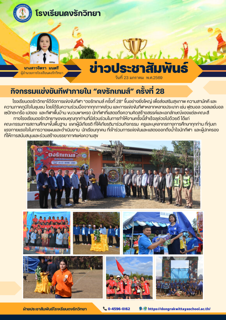 ข่าวกิจกรรม, ข่าวประชาสัมพันธ์, จดหมายข่าวประชาสัมพันธ์โรงเรียนดงรักวิทยาจัดกิจกรรมแข่งขันกีฬาภายใน ดงรักเกมส์ ครั้งที่ 28 เมื่อวันที่ 22-23 มกราคม 2569 admin / 26 มกราคม 2026 นายพรหมพิพัฒน์ พรหม