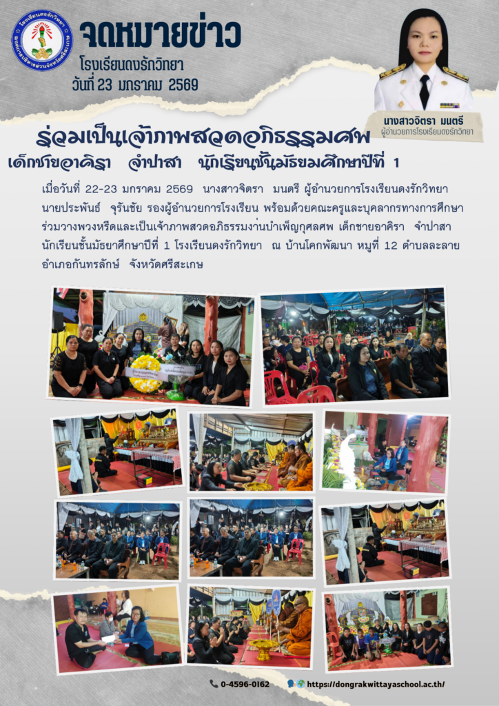 ข่าวกิจกรรม, จดหมายข่าวประชาสัมพันธ์วันที่ 22-23 มกราคม 2569 โรงเรียนดงรักวิทยา ร่วมเป็นเจ้าภาพสวดอภิธรรมศพ เด็กชายอาคิรา จำปาสา นักเรียนชั้นมัธยมศึกษาปีที่ 1 admin / 27 มกราคม 2026 เมื่อวันที่ 22-23 มก