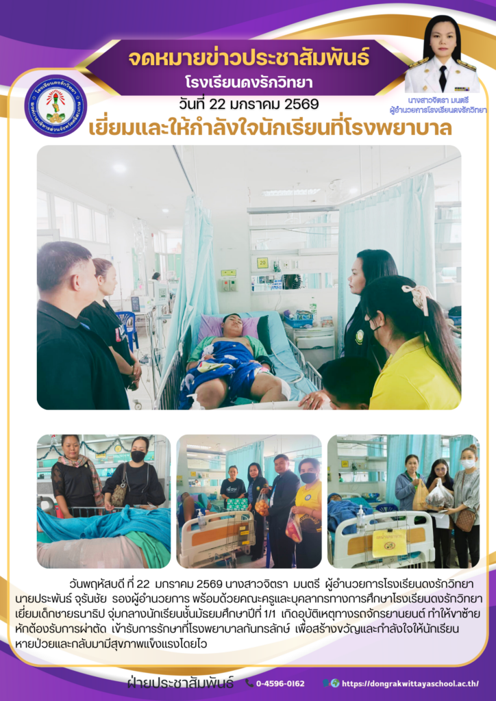 ข่าวกิจกรรม, ข่าวประชาสัมพันธ์, จดหมายข่าวประชาสัมพันธ์เมื่อวันที่ 22 มกราคม 2569 ผู้อำนวยการโรงเรียนดงรักวิทยาพร้อมคณะเยี่ยมและให้กำลังใจเด็กชายธนาธิป จุ่มกลางนักเรียนชั้นมัธยมศึกษาปีที่ 1/1 admin / 27 มกราคม 2026 วันพฤหัสบดี ที่ 22 ม