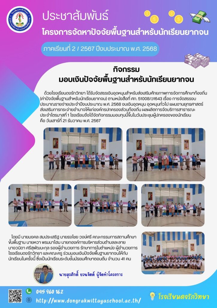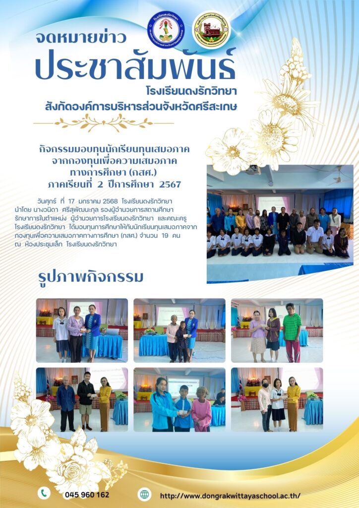 ข่าวกิจกรรมมอบทุนเสมอภาคทางการศึกษา(กสศ.) ประจำภาคเรียนที่2/ 2567 admin / 17 มกราคม 2025 @@@ โรงเรียนดงรักวิท