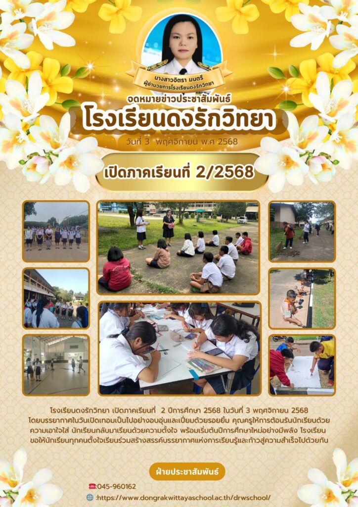 ข่าวกิจกรรม, จดหมายข่าวประชาสัมพันธ์โรงเรียนดงรักวิทยา เปิดภาคเรียนที่ 2 ปีการศึกษา 2568 ในวันที่ 3 พฤศจิกายน 2568 admin / 12 พฤศจิกายน 2025 โรงเรียนดงรักวิทยา เ